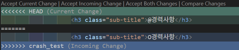 | Incoming Change | 내가 병합하려는 브랜치의 내용 | 예: crash_test |